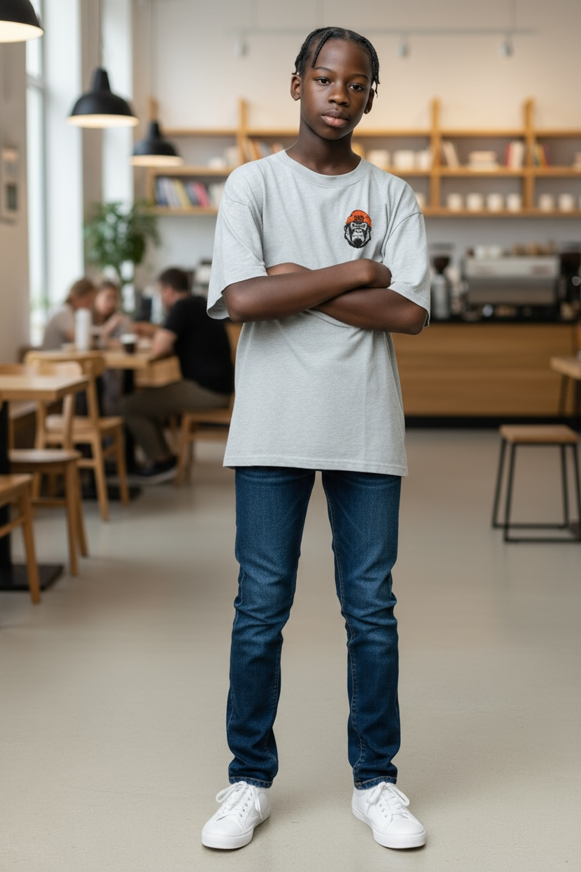 Grey cotton shirt with black gorilla logo w/orange hat.