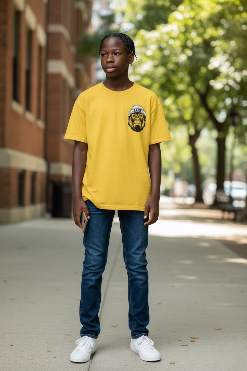 Adult size comfortable and durable true to size. Yellow cotton shirt Black gorilla logo w/ white hat. Hustle over Hope in white